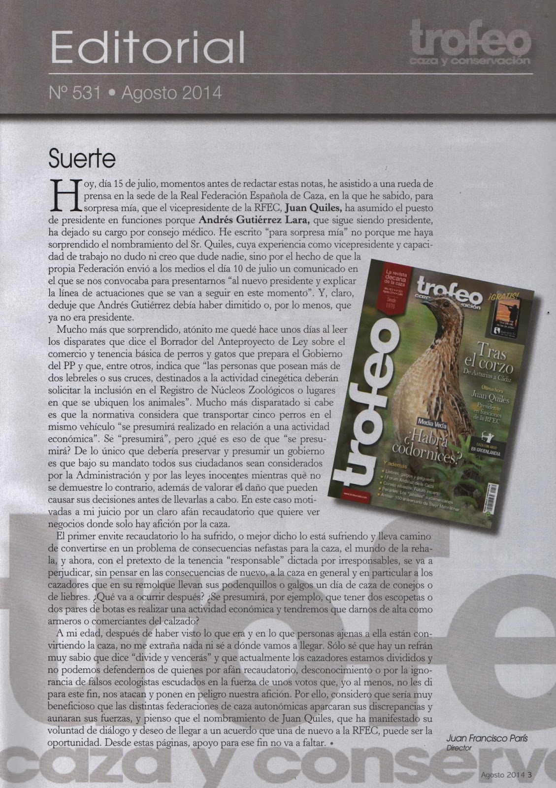 En lugar de enrollarme voy a dejar aquí un par de cosas que me han parecido muy congruentes. Una se la debemos a Salvador Muñoz Cerezo, que ha llegado a escribir al Sr. Rajoy, Otra es la editorial de "mi" revista TROFEO, y la tercera es de Paco Beltrán, presidente del aula cinegética del Circulo de la Amistad de Córdoba y factotum de las MONTERÍAS TRADICIONALES que se vienen organizando por estos lares: Sacad vosotros las conclusiones.